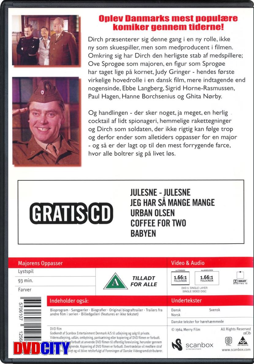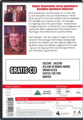 Dirch præsenterer sig denne gang i en ny rolle, ikke ny som skuespiller, men som medproducent i filmen. Omkring sig har Dirch den herligste stab af medspillere. Ove Sprogøe som majoren, en figur som Sprogøe har taget lige på kornet, Judy Gringer hendes første virkelige hovedrolle i en dansk film mere indtagende end nogensinde, Ebbe Langberg, Sigrid Horne Rasmussen, Poul Hagen og Ghita Nørby. | Ekstra features: