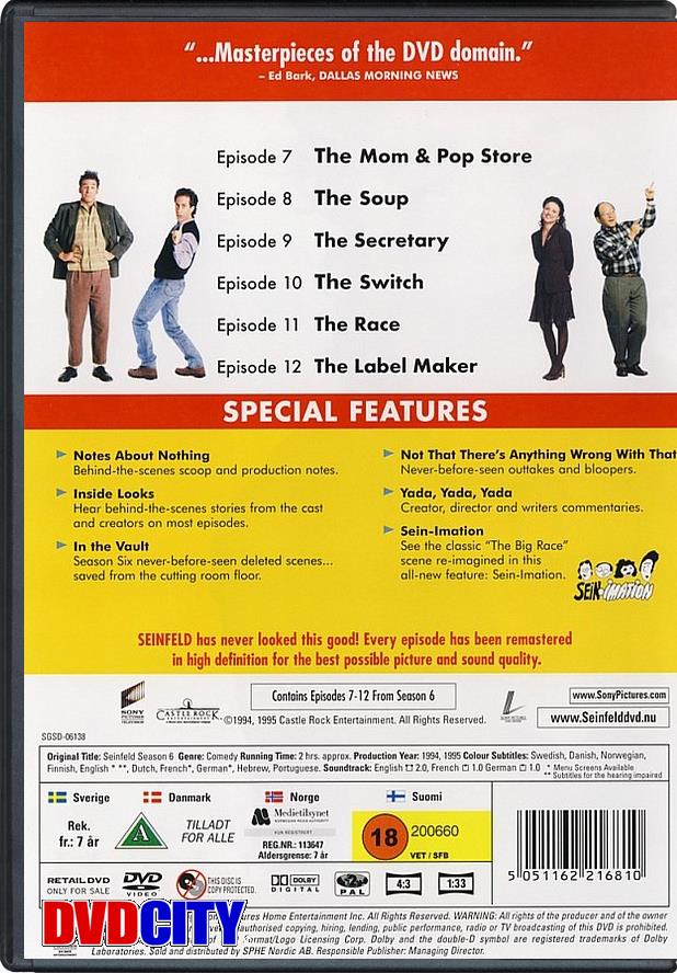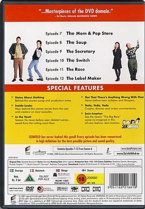 Beskrivelse: [ Dansk Engelsk ] Stand-up comedian Jerry Seinfeld stars in this innovative, half-hour series which blends situation comedy with his own stand-up routines. Seinfeld and writer Larry David have created an intriguing, refreshing view of single adulthood by tapping into the comedian's mind and revealing how real events and problems, such as male friendship, romance, careers and sporting endeavors, find their way into his on-stage comedy act. The series co-stars Tony Award winner Jason Alexander as George -- Jerry's shirt-off-the-back, go the extra-mile, anything for a pal, but please love me, please love me best friend. Saturday Night Live alumni Julia Louise-Dreyfus as Elaine -- Jerry's purely platonic, but still very close ex-girlfriend; and Michael Richards stars as Kramer, Jerry's slightly off-the wall, but not quite over the edge, neighbor, who is as devoted to him as a roadie is to a musician. | Ekstra features: