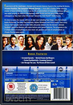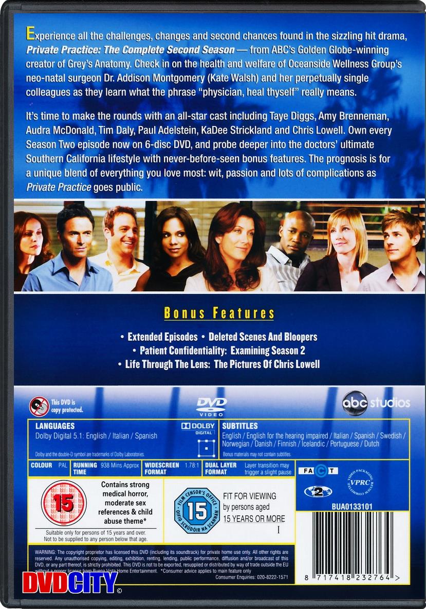 | Beskrivelse: [ Dansk Engelsk ] Fra skaberne af succes-serien Greys Hvide Verden kommer nu anden sæson af Private Practice. Det er tid til at vende tilbage til Californien hvor neonatalkirurgen Addison Montgomery (Kate Walsh) nu arbejder på privatklinikken Oceanside Wellness Group. Der er bestilt tid til en skøn blanding af kærlighed, intriger og dramatik i en af TVs mest fremadstormende serier! Beskrivelse: [ Dansk Engelsk ] All 22 episodes from the second season of the comedy drama series. The series follows renowned surgeon Dr Addison Montgomery (Kate Walsh) as she joins a group of her old medical school friends to set up a private practice in Los Angeles.
