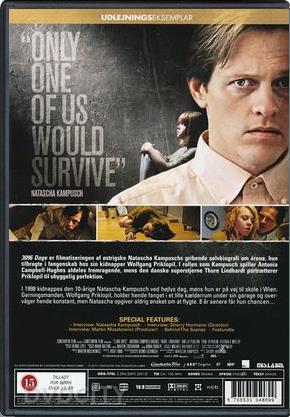 Thure Lindhardt spiller Kampuschs kidnapper og Trine Dyrholm den bekymrede mor. Filmen er baseret på bogen af samme navn som har ligget nummer 1 på den danske bestseller pocket book liste. Natacha Kampusch selv har rost filmen for at give et troværdigt billede af sandheden samt filmens fantastiske skuespillerpræstationer. | Ekstra features: