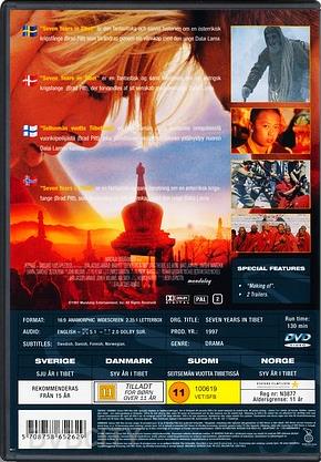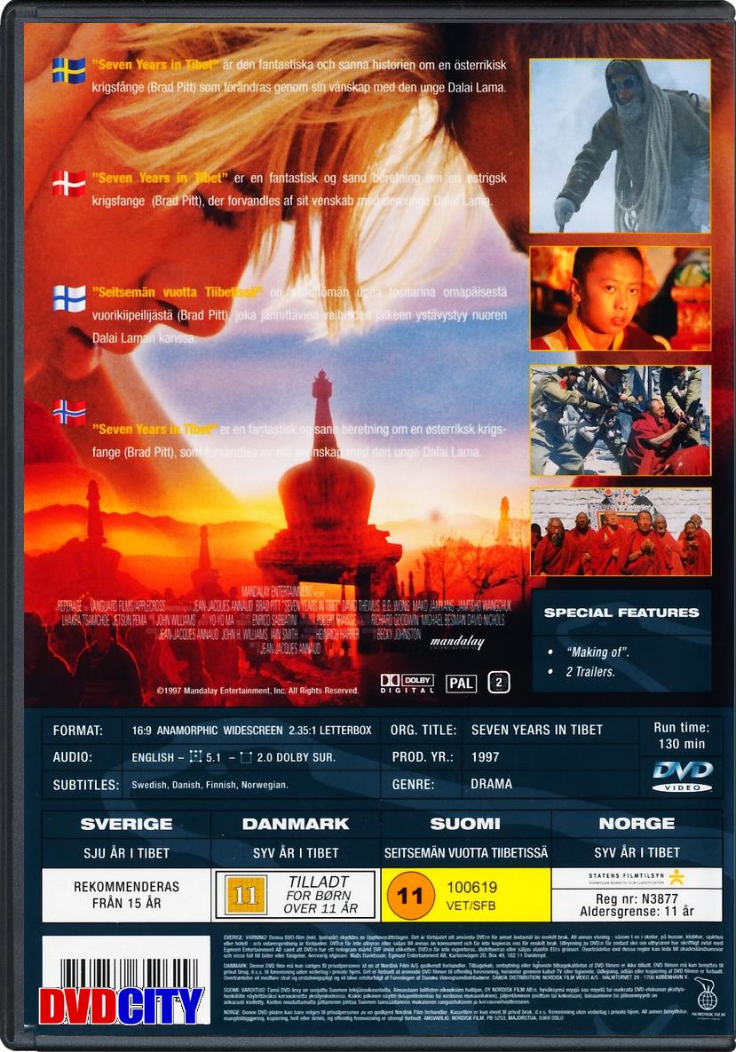 | Beskrivelse: [ Dansk Engelsk ] I 1939 indleder de berømte østrigske bjergbestigere Heinrich og Peter en rejse, der skal bringe dem op på en af Himalayas højeste og mest vanskelige tinder at bestige. Fra det ultimative rush til den voldsomme nedtur, da de indfanges i en engelsk krigsfangelejer. Det lykkedes dem at undslippe lejeren, og en fantastisk rejse til tibetanernes hellige by, Lhasa, kan begynde. Dette er historien om et uforglemmeligt venskab mellem Harrer og den unge Dalai Lama.. Et møde mellem to verdener.. Beskrivelse: [ Dansk Engelsk ] In the autumn of 1939, Heinrich Harrer (Brad Pitt) and Peter Aufschnaiter (David Thewlis), set out to climb Nanga Parbat, one of the highest peaks in the Himalayas. The self-centred Harrer, whose sole preoccupation was the achievement of fame and glory, would experience an emotional awakening on his fantastic journey that would take him from the heights of conquest to the depths of internment in a British prisoner of war camp, then from escape and a harrowing two year trek through the Himalayas, to the mysterious Tibetan city of Lhasa. As a stranger in a strange land which few westerners have ever visited, Harrer befriends the young Dalai Lama, and is asked to tutor the religious leader in the ways of the Western world. graced with the friendship and the spiritual enlightenment of the young Dalai Lama, a deep bond forms and the egotistical Harrer experiences selflessness for the first time. But this idyllic world is about to be shattered by a force that cannot be ignored... | Ekstra features: