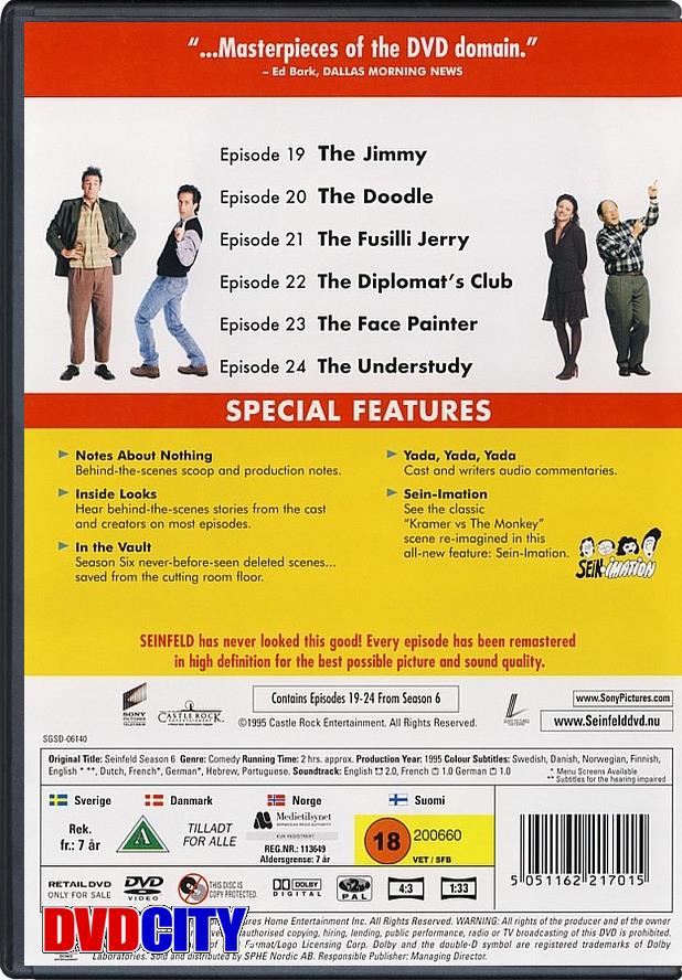 Beskrivelse: [ Dansk Engelsk ] Stand-up comedian Jerry Seinfeld stars in this innovative, half-hour series which blends situation comedy with his own stand-up routines. Seinfeld and writer Larry David have created an intriguing, refreshing view of single adulthood by tapping into the comedian's mind and revealing how real events and problems, such as male friendship, romance, careers and sporting endeavors, find their way into his on-stage comedy act. The series co-stars Tony Award winner Jason Alexander as George -- Jerry's shirt-off-the-back, go the extra-mile, anything for a pal, but please love me, please love me best friend. Saturday Night Live alumni Julia Louise-Dreyfus as Elaine -- Jerry's purely platonic, but still very close ex-girlfriend; and Michael Richards stars as Kramer, Jerry's slightly off-the wall, but not quite over the edge, neighbor, who is as devoted to him as a roadie is to a musician. | Ekstra features: