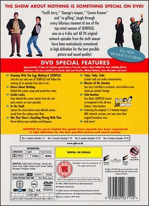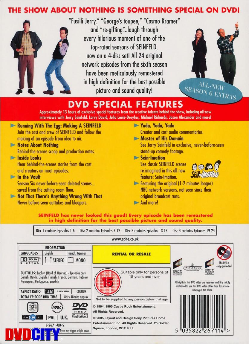 Interviews with Jerry Seinfeld, Larry David, Julia Louis-Dreyfus, Michael Richards, Jason Alexander and more! Running With The Egg: Making A Seinfeld - Join the cast and crew of Seinfeld and follow the making of an episode from idea to air. Notes About Nothing - Behind-the-scenes scoop and production notes. Inside Looks - Hear behind-the-scenes stories from the cast and creators on most episodes. In The Vault - Season Six never-before-seen deleted scenes.. saved from the cutting room floor. Not That There's Anything Wrong With That - Never-before-seen outtakes and bloopers. Yada, Yada, Yada - Creator and cast audio commentaries. Master of His Domain - See Jerry Seinfeld in exclusive, never-before-seen stand-up comedy footage. Sein-Imation - See classic Seinfeld scenes re-imagined in this all-new feature: Sein-Imation. Featuring the original (1-2 minutes longer) NBC network versions, not seen since their original broadcast runs.