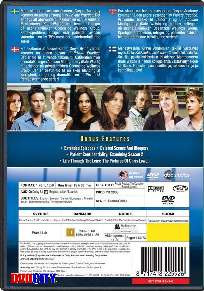 | Beskrivelse: [ Dansk Engelsk ] Fra skaberne af succes-serien Greys Hvide Verden kommer nu anden sæson af Private Practice. Det er tid til at vende tilbage til Californien hvor neonatalkirurgen Addison Montgomery (Kate Walsh) nu arbejder på privatklinikken Oceanside Wellness Group. Der er bestilt tid til en skøn blanding af kærlighed, intriger og dramatik i en af TVs mest fremadstormende serier! Beskrivelse: [ Dansk Engelsk ] All 22 episodes from the second season of the comedy drama series. The series follows renowned surgeon Dr Addison Montgomery (Kate Walsh) as she joins a group of her old medical school friends to set up a private practice in Los Angeles.